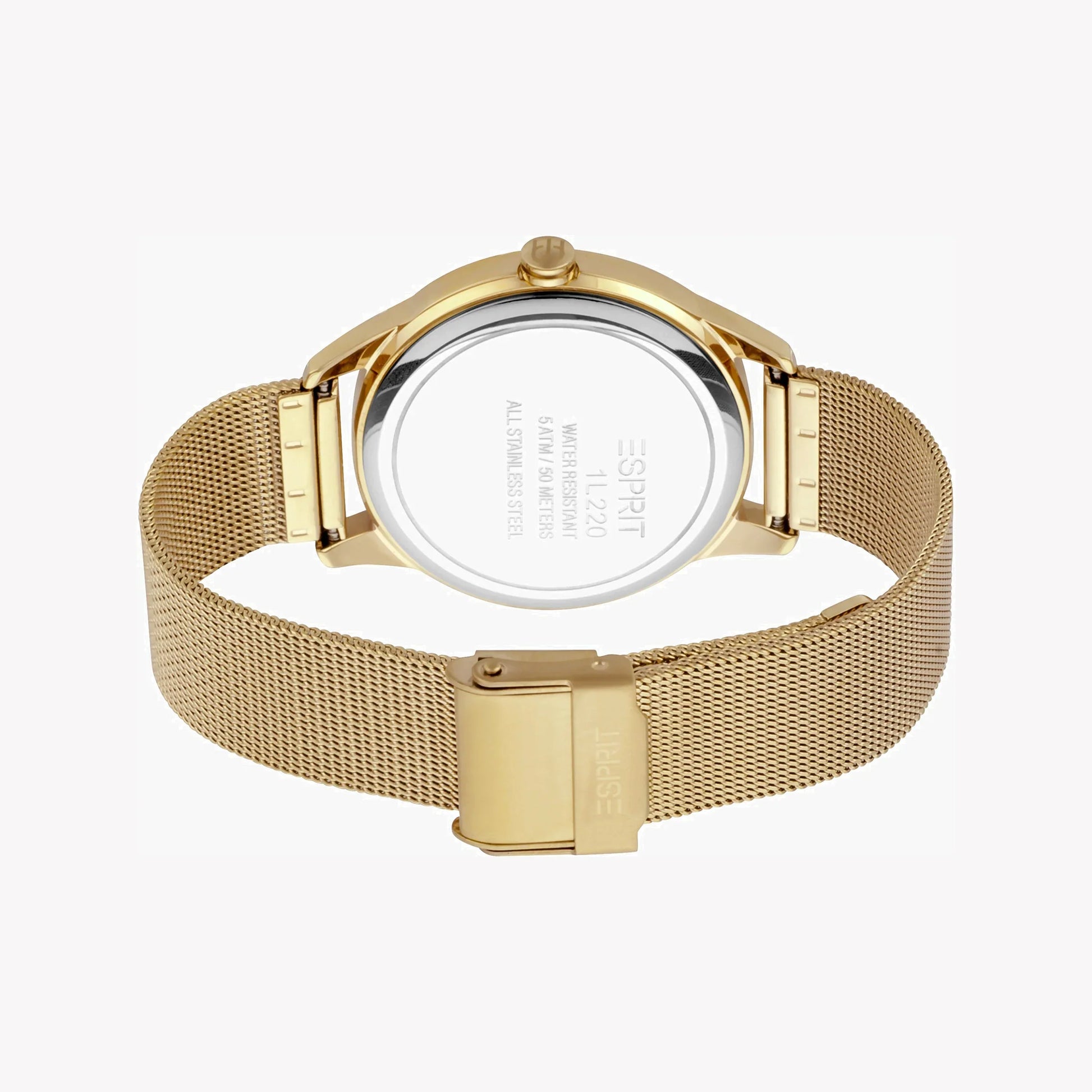 Det er på tide å oppgradere stilen din. Vårt Esprit dame er det perfekte tilbehøret til ethvert antrekk. Med en gullfarget rustfritt stål-rem og en champagnefarget urskive har dette uret alt du trenger. Det er nøye designet for å være både tidløst og stilig, slik at du ser bra ut fra dag til dag. Dette Esprit-uret er laget av rustfritt stål, noe som gjør det svært holdbart og som pålitelig. Det har en rund gullfarget rustfritt stål-urkasse med en diameter på 38 mm, som vil være et flott tilskudd til antrekket ditt.