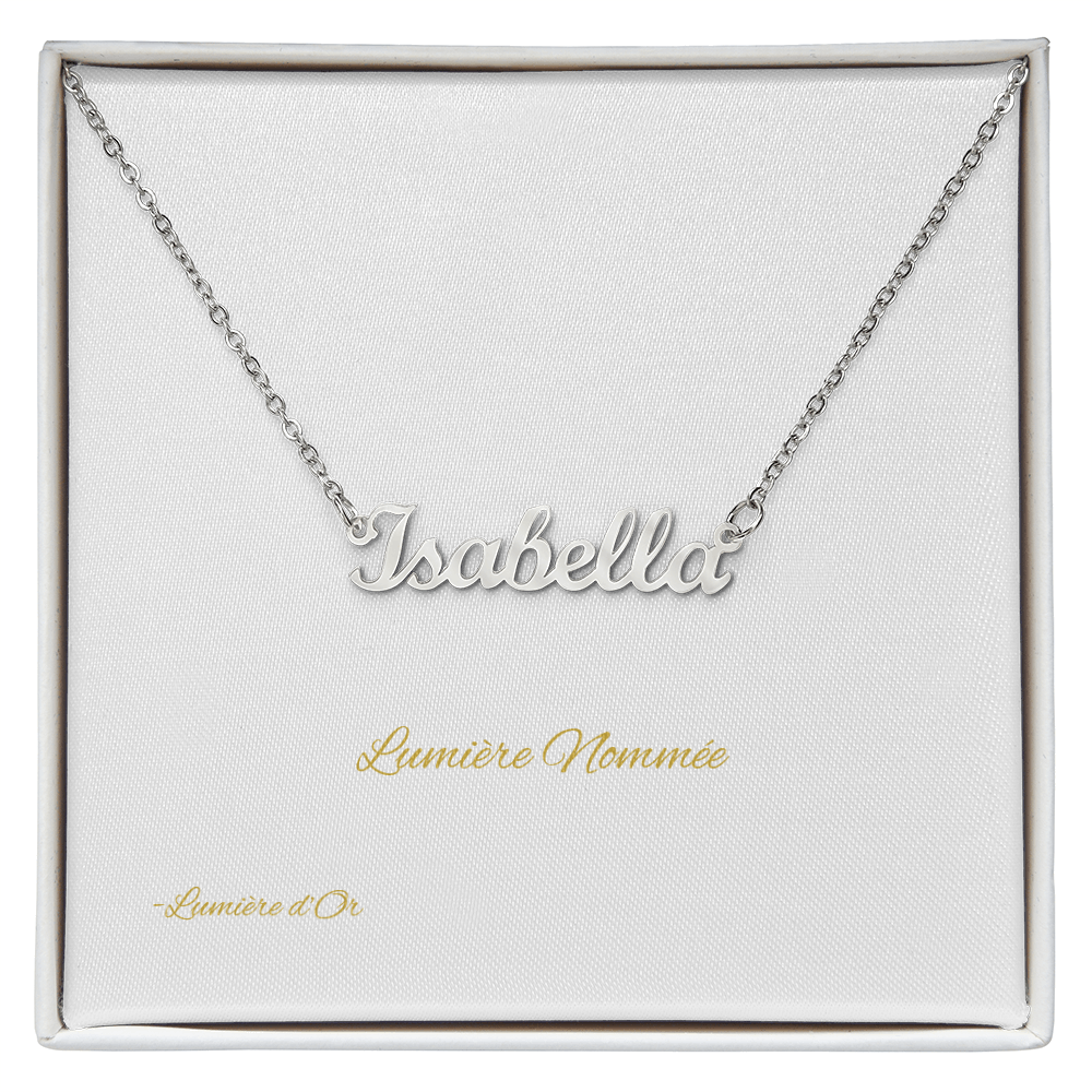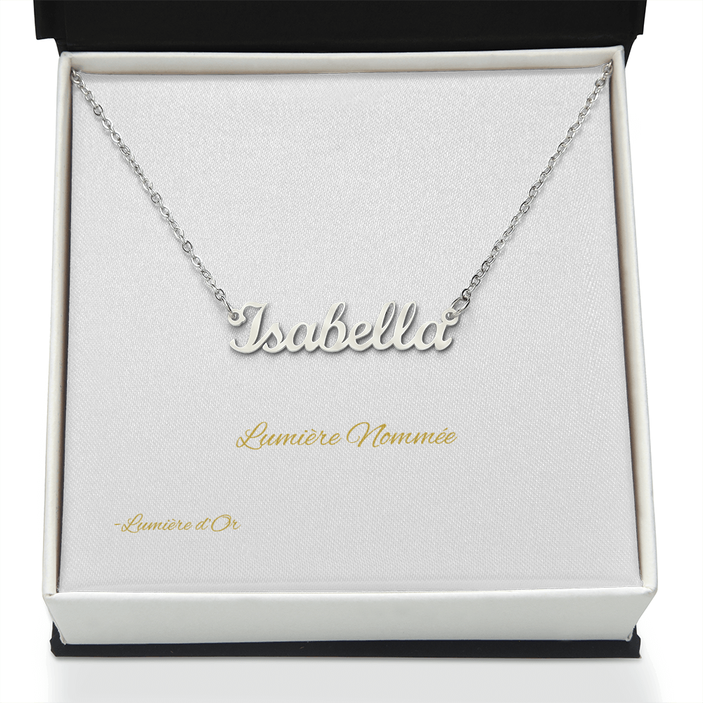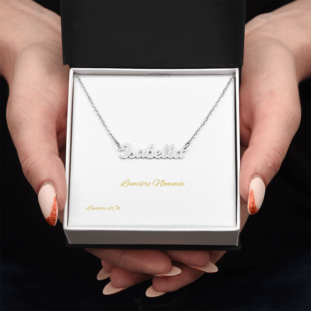 Lumière Nommée – vårt personlige navnesmykke – er mer enn en gave. Det er et lite, skinnende bevis på hvor mye noen betyr for deg. Et navn i elegant kursiv, formet med kjærlighet og båret nær hjertet, som et navngitt lys som aldri slukner – like unikt som følelsene bak.